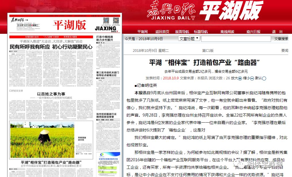 相伴宝首席信息官许雪明在接受记者采访时表示:“相伴宝”产业互联网共享服务平台,是通过平台为全球箱包产业链的各类企业提供设计打样、订单共享、原料集采、产能共享、检测验货、物流货运、跨境仓库、供应链金融、品牌分销等产业”路由器”服务。